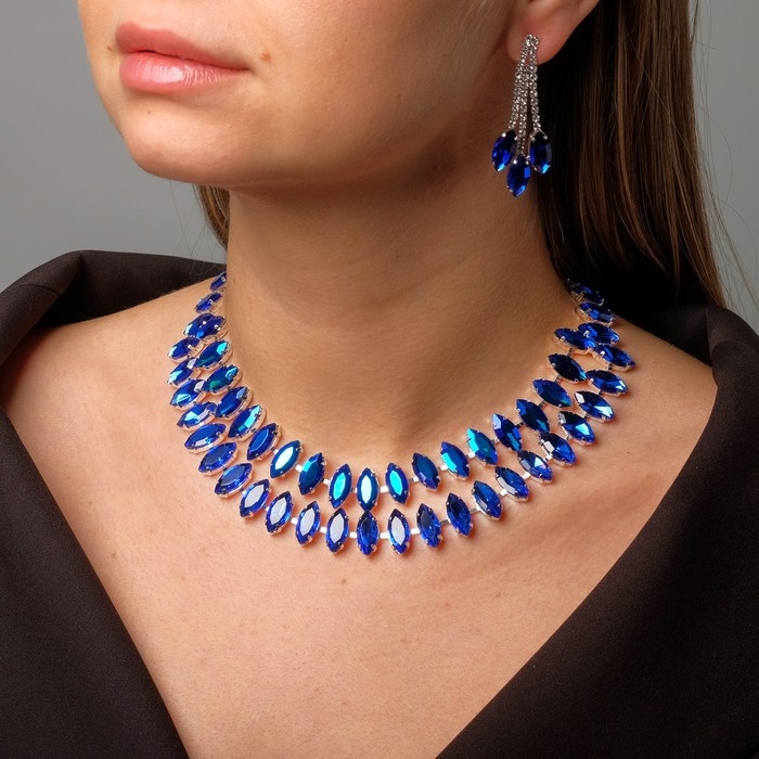Набор 2 предмета: серьги, колье «Торжество» лепестки в 2 ряда, цвет бело-синий в серебре, 40 см