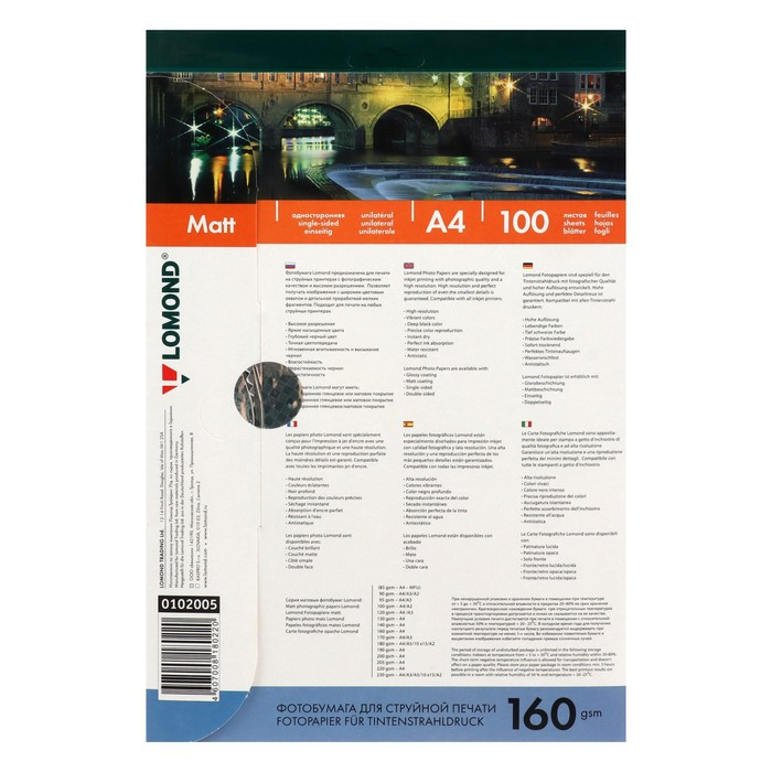 Фотобумага для струйной печати А4, 100 листов LOMOND, 160 г/м2, односторонняя, матовая