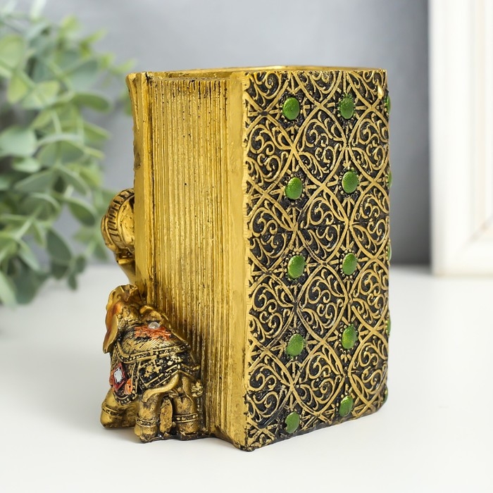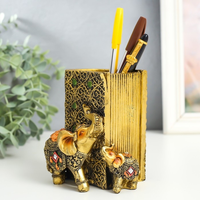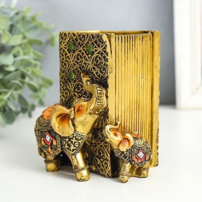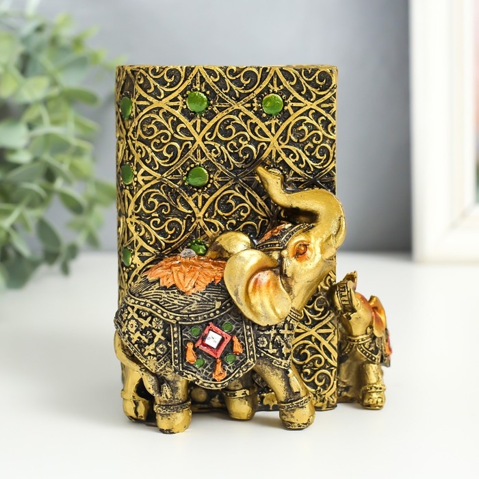 Сувенир полистоун карандашница "Слон и слонёнок в попоне с цветком" бронза 8,5х9х11,5 см