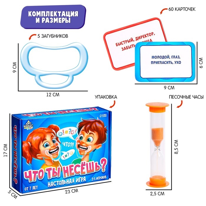 С настольной игрой «Что ты несёшь?» ребёнок прокачает дикцию и коммуникативные способности. Проговаривать слова с загубником во рту не так уж просто, но крайне интересно, поэтому игроков быстро захватит спортивный азарт.