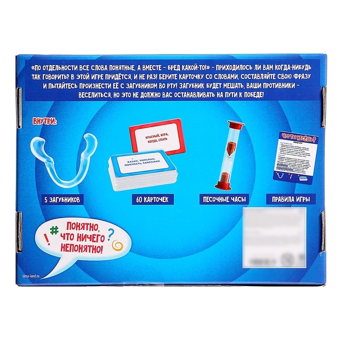 Проверьте, насколько хорошо вас понимают друзья с настольной игрой «Что ты несёшь?». Составьте слова с карточки в предложение и попытайтесь его проговорить с загубником во рту. Не забывайте — время ограничено! Действуйте быстро, не давайте соперникам смеяться над вами и докажите, кто достоин победы!