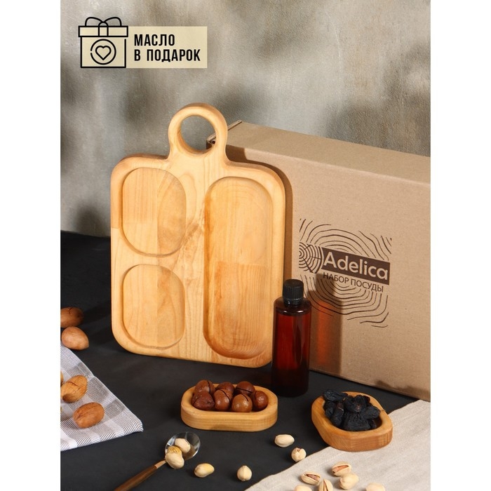 Подарочный набор деревянной посуды Adelica, доска сервировочная 3 секции, 2 менажницы съёмные, масло в подарок 100 мл, берёза