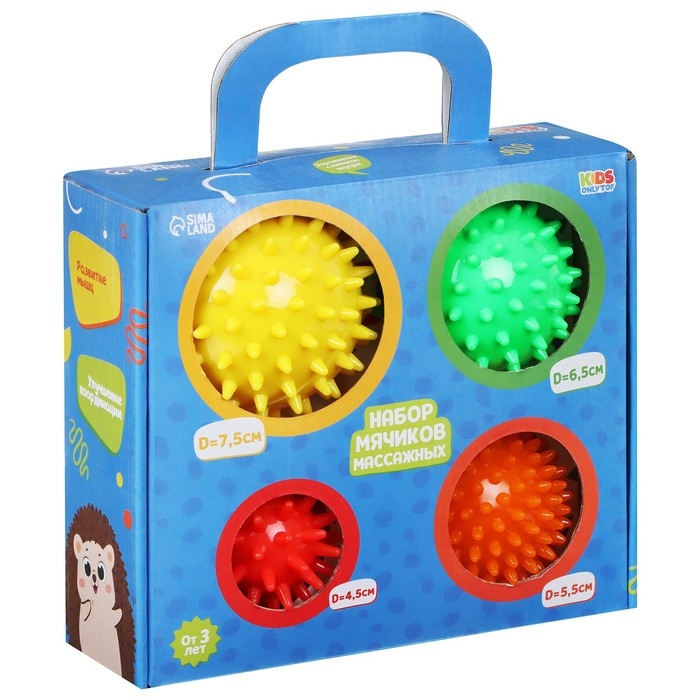 Набор массажных мячей подходит для детей и взрослых. Предназначен для физического воздействия на биологически-активные точки на теле человека для профилактики и лечения ряда заболеваний. С целью общего оздоровления организма, укрепления иммунитета, расслабления, снятия физического и психоэмоционального перенапряжения. Массажёр развивает моторику рук ребёнка, способствует улучшению памяти, внимания и развитию речи.