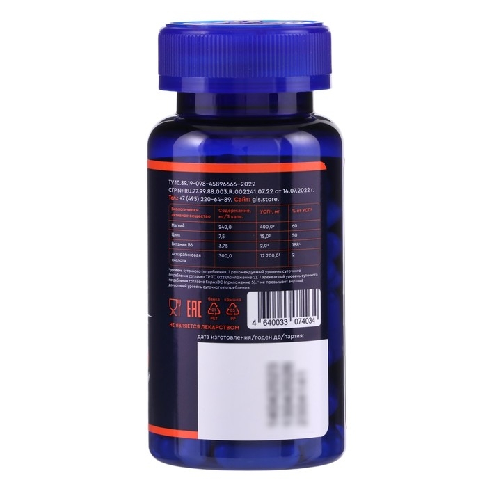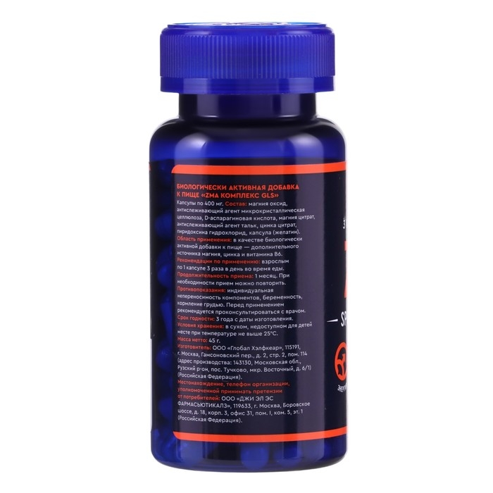 ZMA комплекс GLS с магнием, цинком и аспарагиновой кислотой, 90 капсул по 400 мг