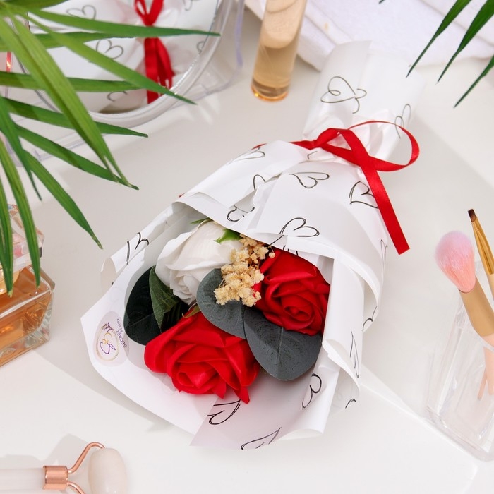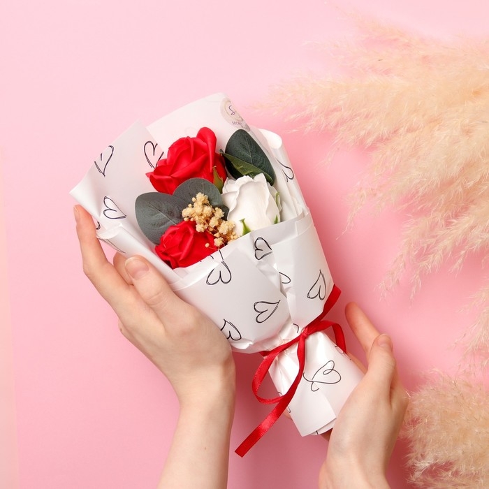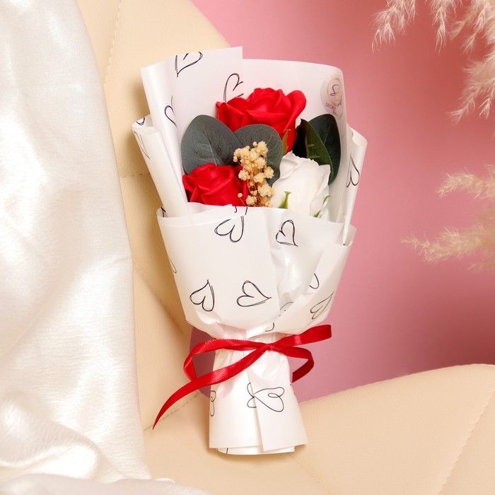 Премиальный букет из красно-белых мыльных роз, 3 шт