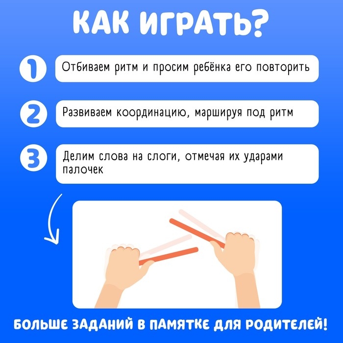 Познакомьте малыша с самым простым музыкальным инструментом — ритмическими палочками (другое название — клавесы) и тренируйте чувство ритма с развивающим набором. Используйте задания из памятки и придумывайте свои мелодии, чтобы помочь ребёнку освоить новые навыки!