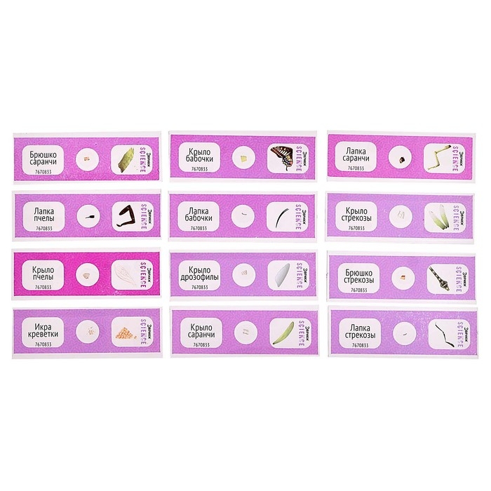 Наборы микропрепаратов делятся на серии, доступны следующие темы для изучения: цветы, животные, растения, насекомые.
