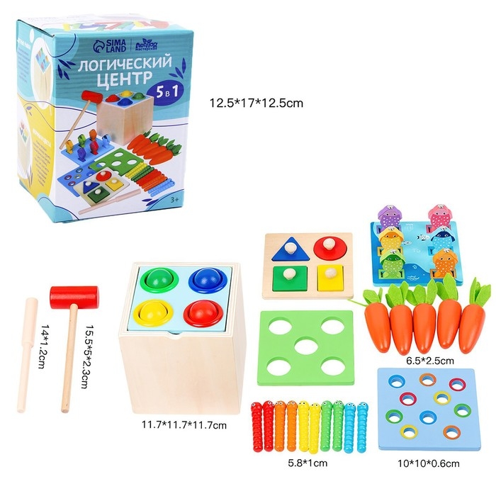 В комплекте: основа-куб, 5 вставных дощечек для каждого вида игры, 4 шарика, 4 вкладыша, 10 магнитных червячков, 6 магнитных рыбок, 5 морковок, молоточек, магнитная удочка.