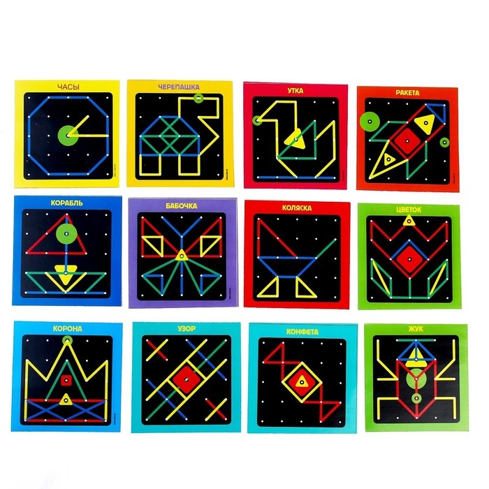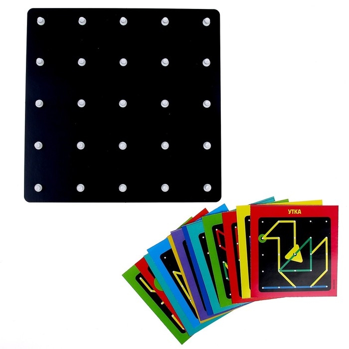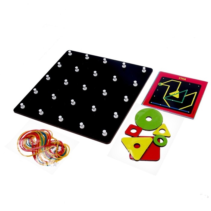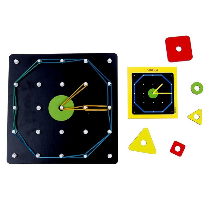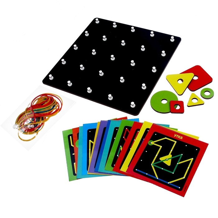 Геоборд — это специальная доска для конструирования различных изображений с помощью равноудалённых друг от друга штырьков и резиночек. Их малышу предстоит нанизывать на выпуклые элементы и создавать таким образом разнообразные фигуры.