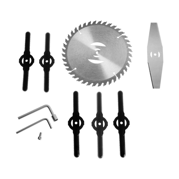 В комплект входят пластиковые ножи, стальной нож и пильный диск, которые справятся с мягкой и жёсткой травой.