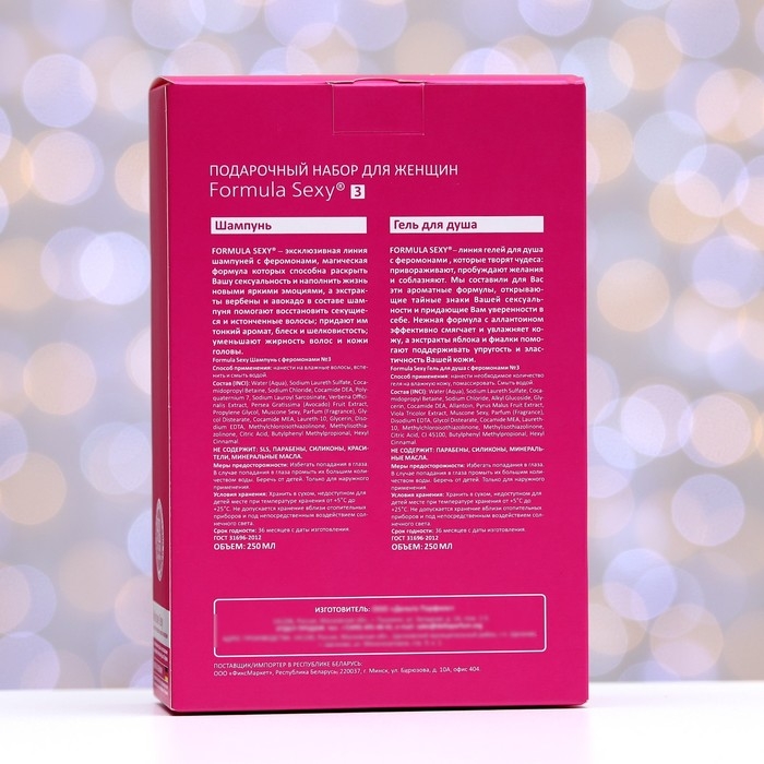 - Гель для душа: Water (Aqua), Sodium Laureth Sulfate, Cocamidopropyl Betaine, Sodium Chloride, Alkyl Glucoside, Glicerin, Cocamide DEA, Allantoin, Pyrus Malus Fruit Extract,Viola Tricolor Extract, Muscone Sexy, Parfum (Fragrance),Disodium EDTA, Glycol Distearate, Cocamide MEA, Laureth-10 Methylchloroisothiazolinone, Methylisothiazolinone, Citric Acid, CI 45100, Butylphenyl Methylpropional, HexylCinnamal.