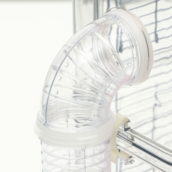 Система тоннелей, выходящая за пределы клетки, приведет в восторг любого хомячка, ведь узкий круглый коридор напоминает нору в земле, которые обычно они роют в дикой природе. Беговое колесо, которое крепится на прутья, является самой любимой игрушкой всех пушистиков, оно необходимо для тренировки тела и траты избыточной энергии.