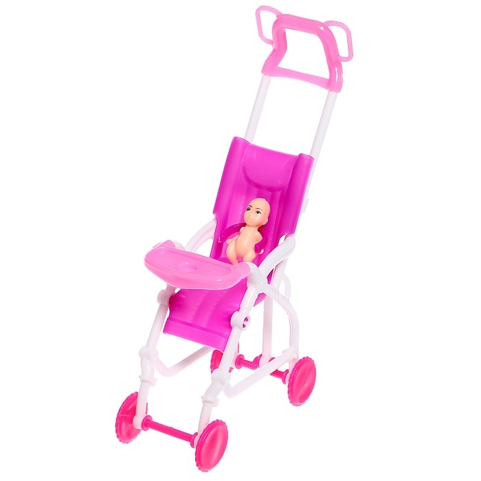 - В комплект входят аксессуары: коляска размером 19 × 11 × 5 см, 3 игрушки-погремушки, мишка, ложка, вилка, соска, горшок, бутылочка. С ними игровые сюжеты станут разнообразнее и реалистичнее!
