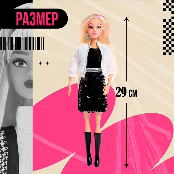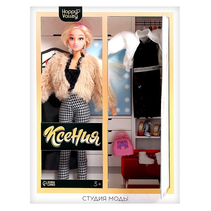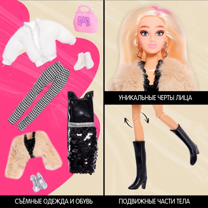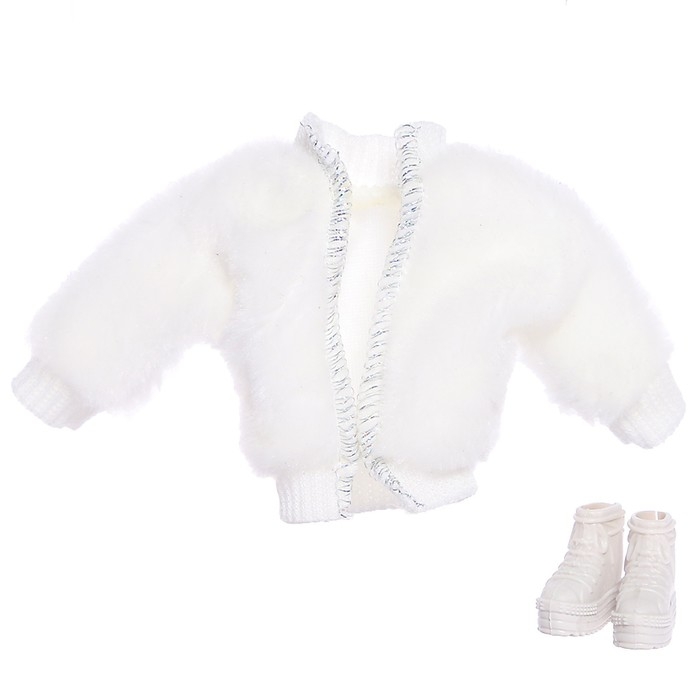 - В комплект входит одежда для создания разных образов: платье, 2 шубки, 3 пары обуви, сумка, штаны, майка.