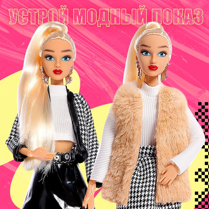 - В комплект входит одежда для создания разных образов: 3 пары обуви, сумка, кофта, юбка, меховая жилетка, укороченный кардиган.