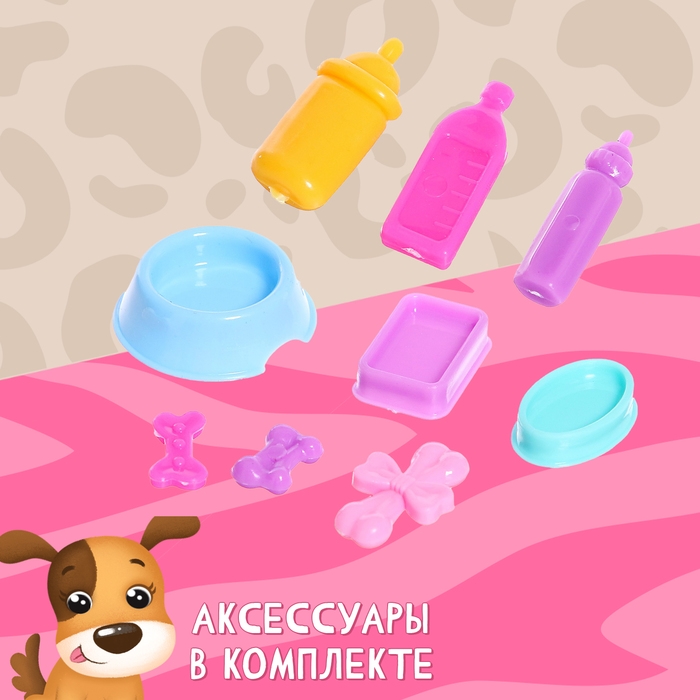 - Есть аксессуары для питомца: лежанка размером 5 × 4 × 1 см, 3 миски, 3 бутылочки для питания, 3 косточки длиной 1 см.