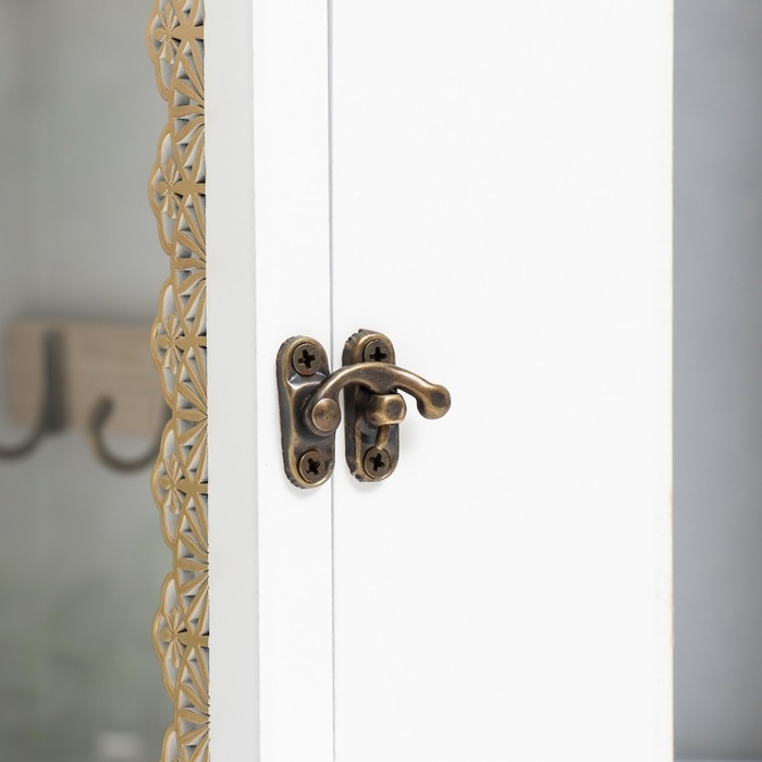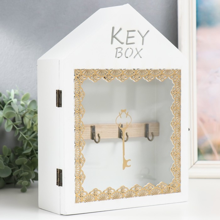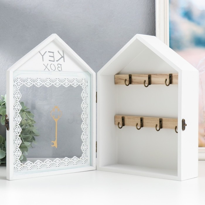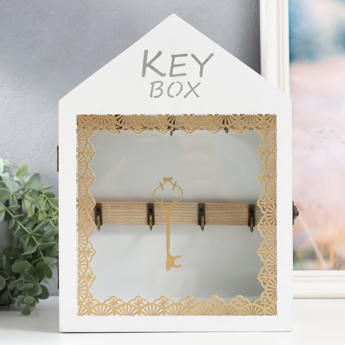 Ключница дерево 7 крючков "Дом. Узоры. Ключ" белая с золотом 22х8х30 см