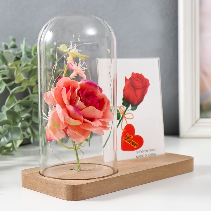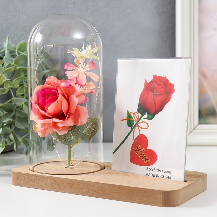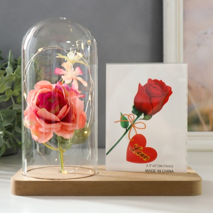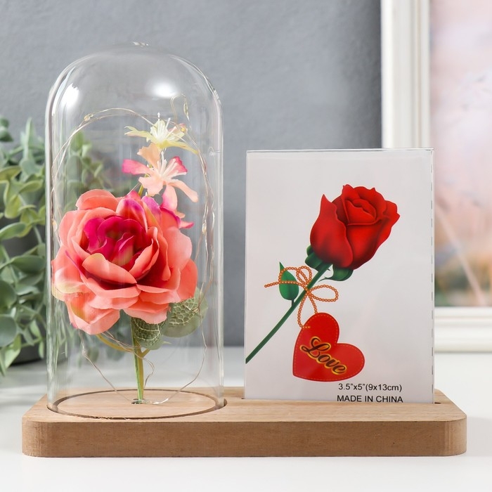 Фоторамка 9х13 см свет "Розовая роза в колбе" от батареек 2хLR1130 9,8х19,5х18 см