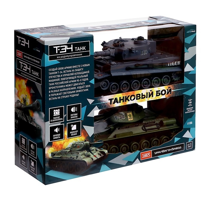 Танковый бой Т-34 vs Tiger — это набор из двух радиоуправляемых танков, которые могут бороться друг с другом. Каждый танк имеет уникальную раскраску и оснащён светом и звуком, чтобы сделать игру более захватывающей.
