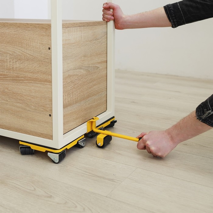 Принцип работы: мебель необходимо поднять с помощью рычага-домкрата и поочерёдно подложить под каждый угол транспортную платформу.
