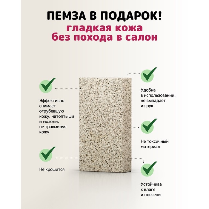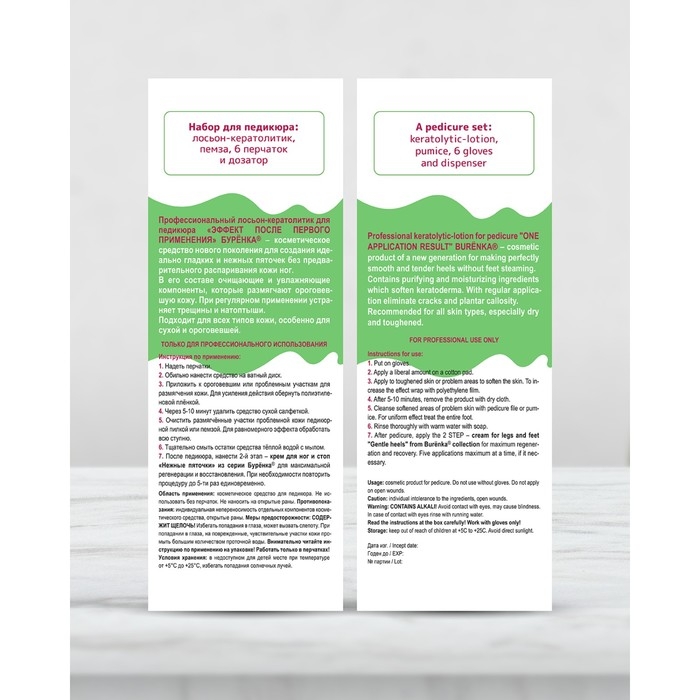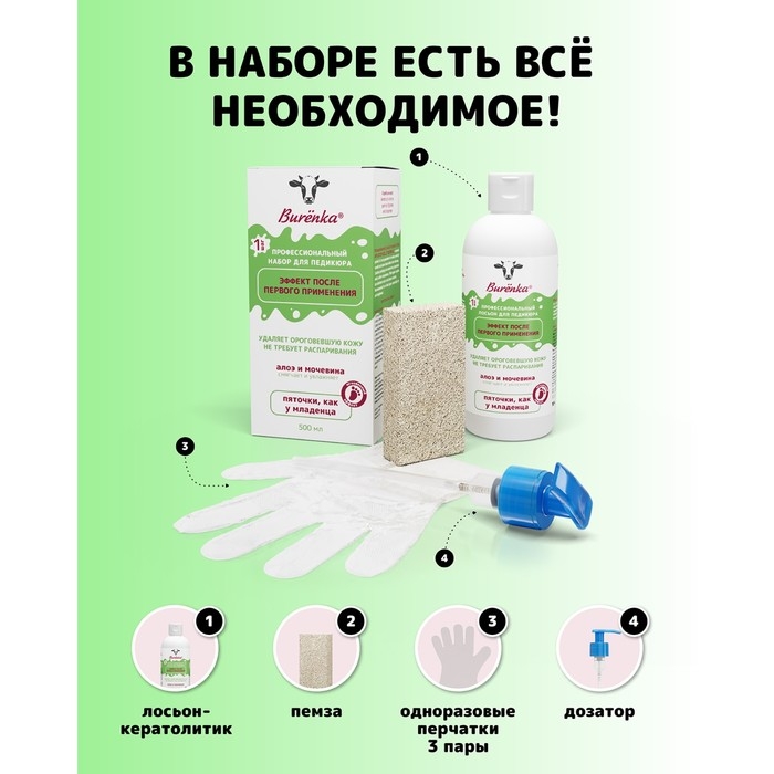 Для удобства в комплекте полный набор для педикюра: лосьон-кератолитик, пемза, 3 пары одноразовых перчаток и дозатор.