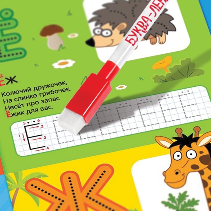 - В комплект входит маркер с фетровой подушечкой на колпачке — можно писать буквы и стирать их сколько угодно.