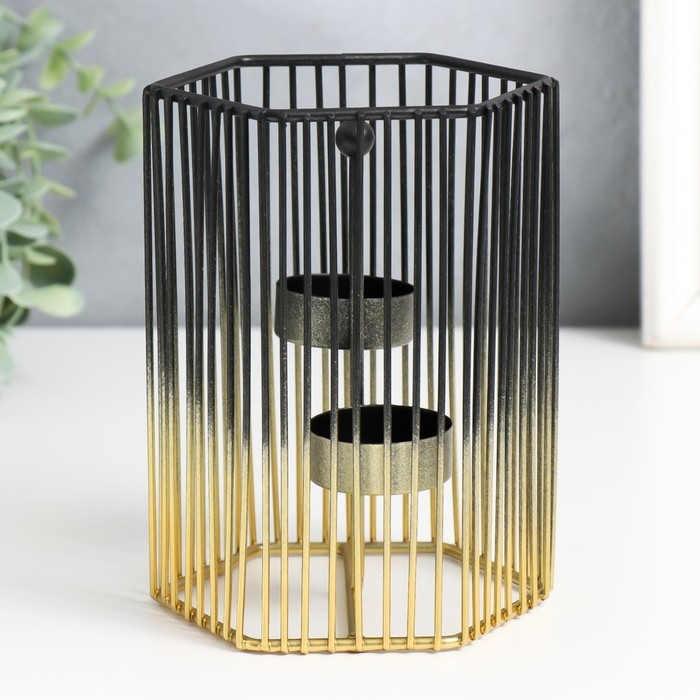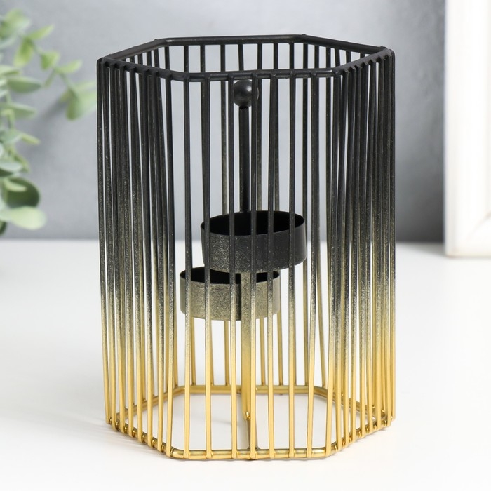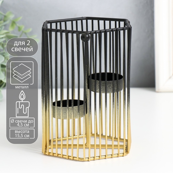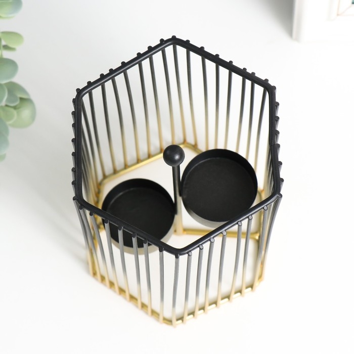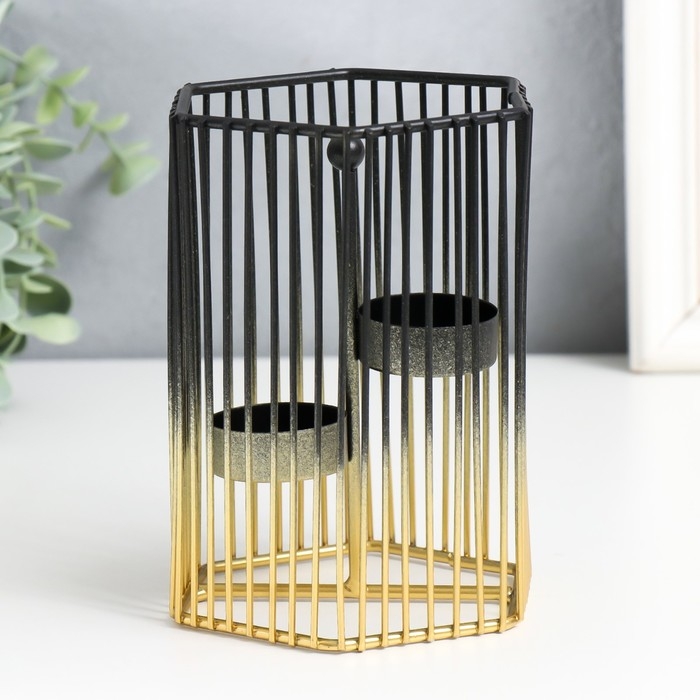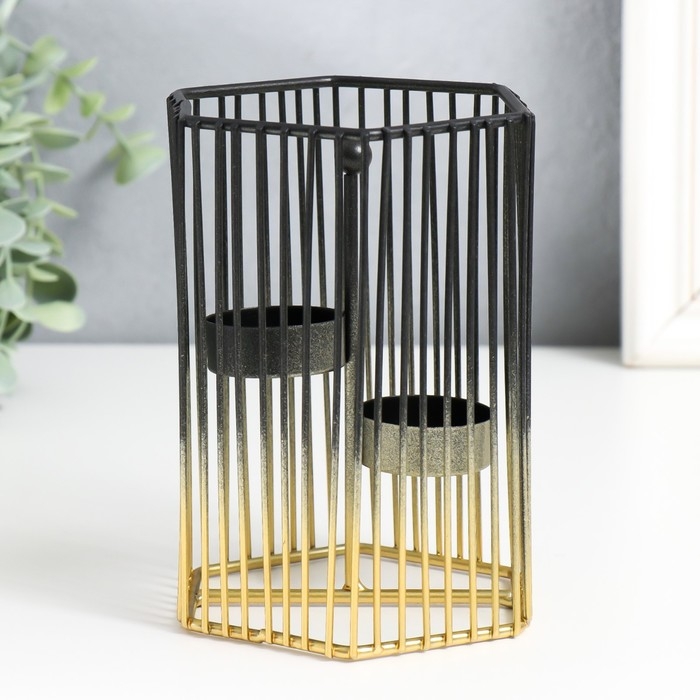 Подсвечник металл на 2 свечи "Шестиугольная клетка" d-4,5 см золот.-чёрный 11,5х11,5х15,5 см 93307