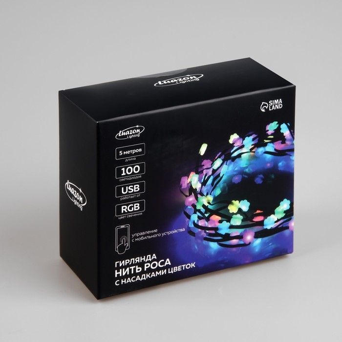 Умная гирлянда «Нить» 5 м роса с насадками «Цветочки», IP20, серебристая нить, 100 LED, пульт ДУ, приложение, свечение RGB, USB