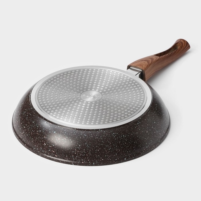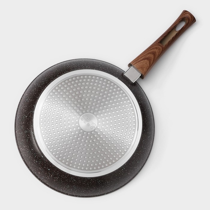 - Высококачественный кованый алюминий с толстым дном 3 мм сохранит форму изделия даже если сковородка была перегрета.