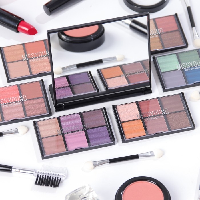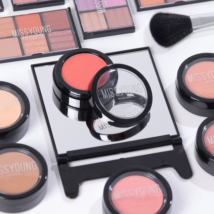 Набор декоративной косметики: тени для век, тени для бровей, блеск для губ, румяна, зеркало