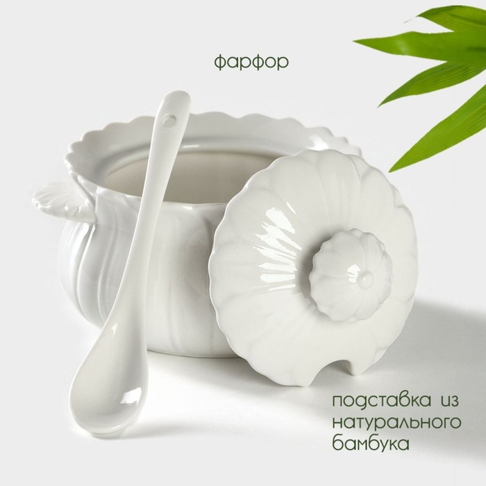Сахарница фарфоровая с ложкой на бамбуковой подставке BellaTenero «Тюльпан», 350 мл, цвет белый