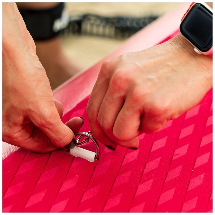 - Запирающийся нажимной клапан с защитой от повреждений обеспечивает герметичность. Кнопочная система помогает без труда приспустить давление в доске, нажав на кнопку в клапане.