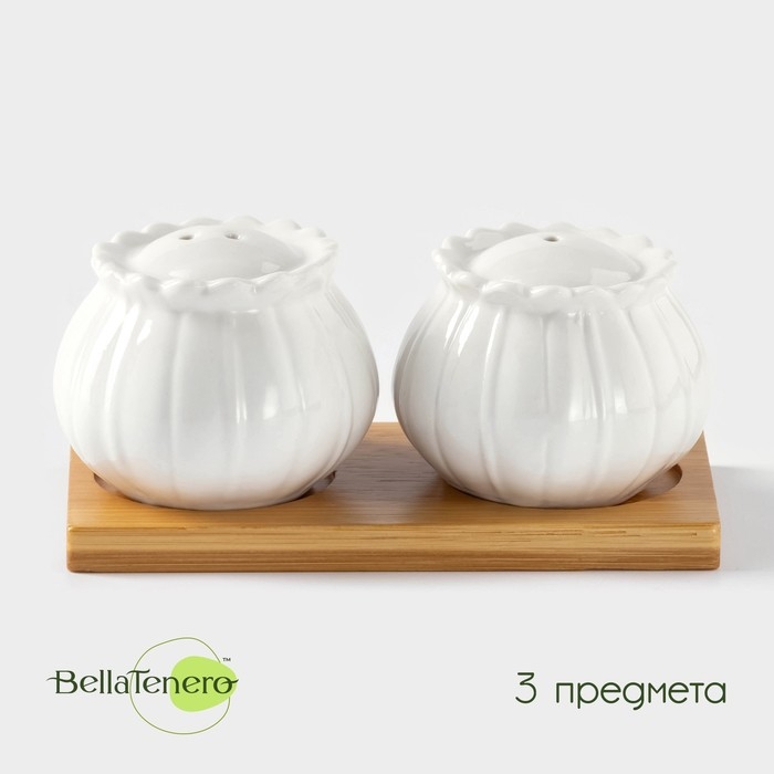 Набор фарфоровый для специй BellaTenero «Тюльпан», 3 предмета: солонка 75 мл, перечница 75 мл, бамбуковая подставка, цвет белый