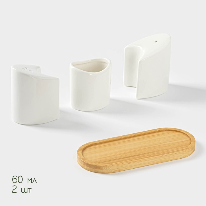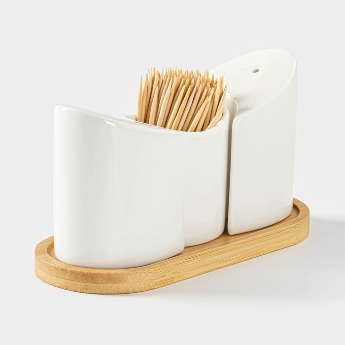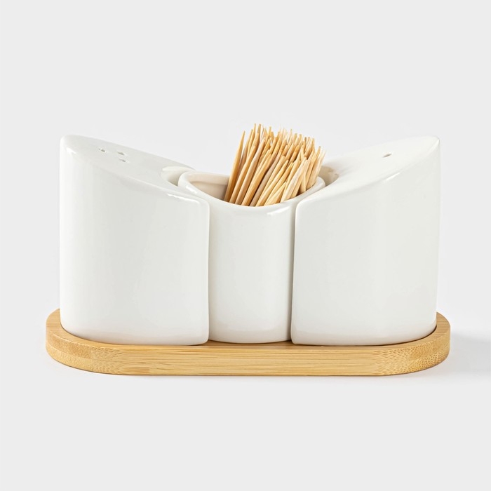 Набор для специй на деревянной подставке BellaTenero, 3 предмета: солонка 60 мл, перечница 60 мл, ёмкость для зубочисток, цвет белый