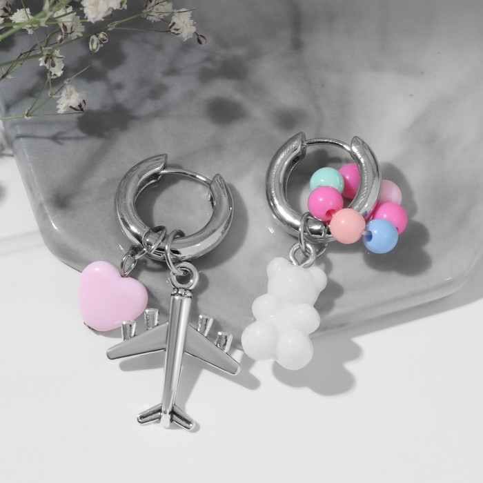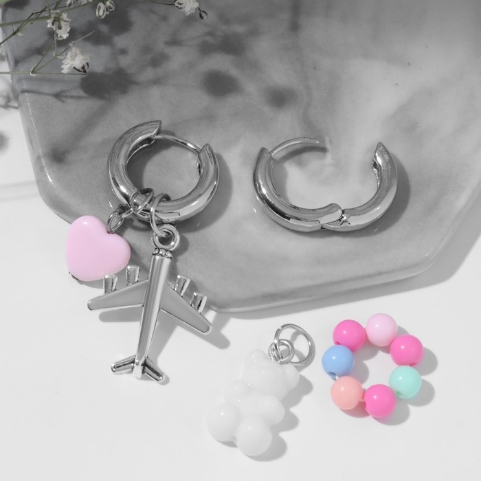 Серьги со съёмным элементом «Трансформер» мишка и сердце, цветные в серебре