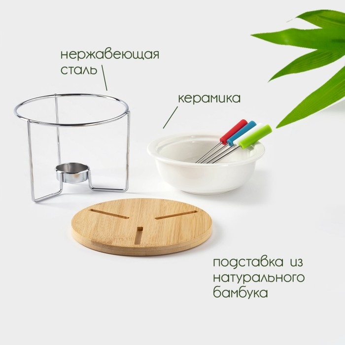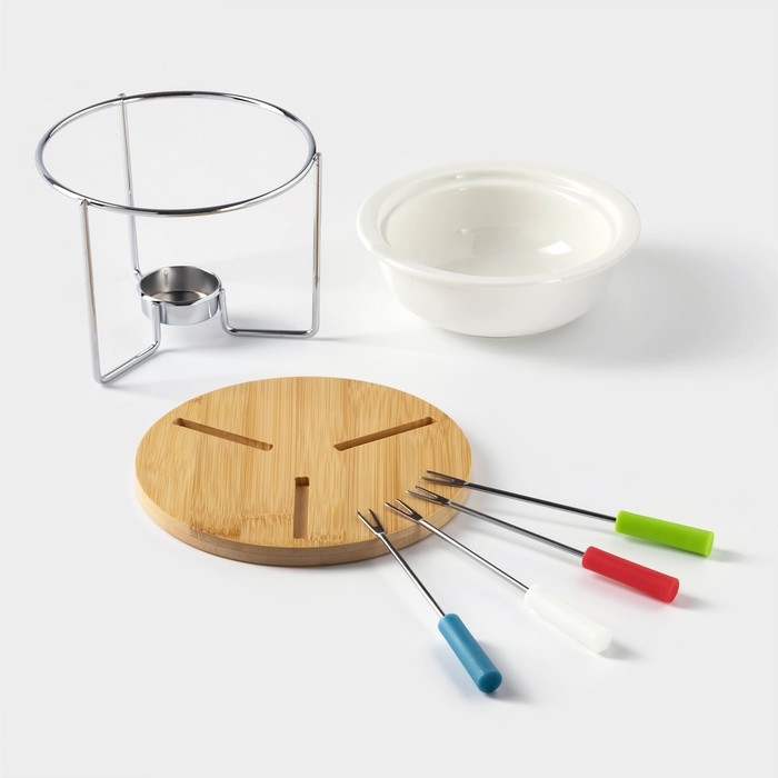 Набор керамический для фондю Доляна «Глянец», 6 предметов: чаша 400 мл, подставка, 4 шпажки, цвет белый
