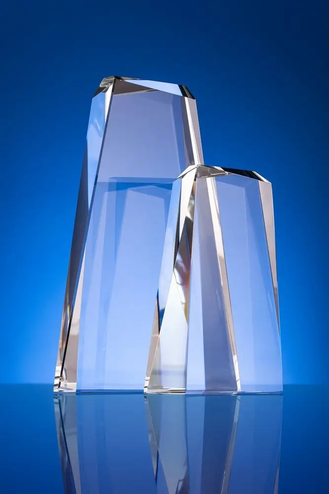 Стела изготовлена из стекла К9, в основе которого лежит оптическое боросиликатное стекло. Эту марку стекла отличает низкий процент посторонних включений, высокий показатель преломления и высокая прозрачность — идеальные качества для изготовления наград премиального уровня.
