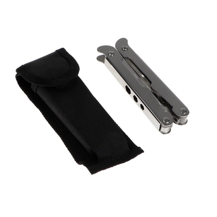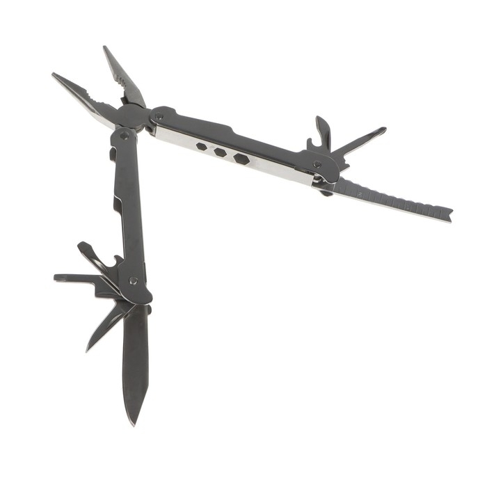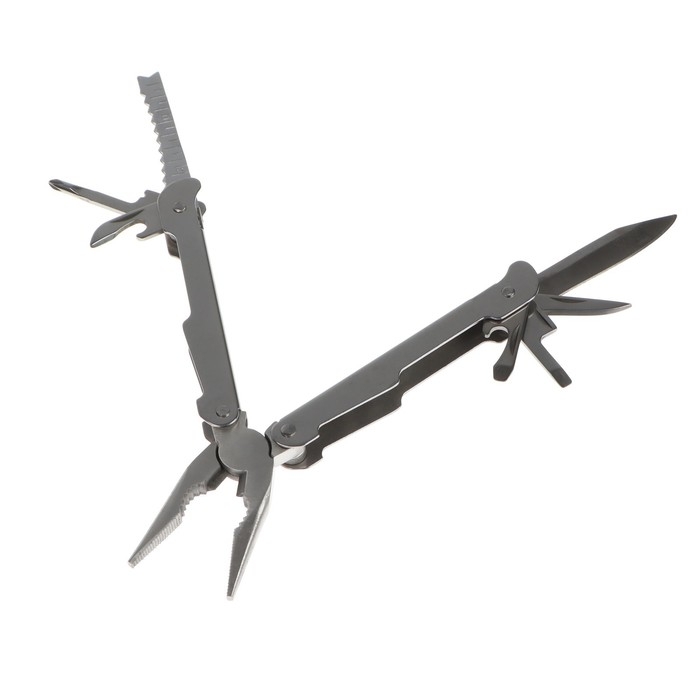 С мультитулом всё необходимое будет под рукой. Устройство оборудовано плоскогубцами, кусачками, линейкой, малым, большим и консервным ножом, а также ножом для чистки рыбы, открывалкой для бутылок и другими функциями. Мультитул удобно разбирать и собирать, хранить можно в чехле.