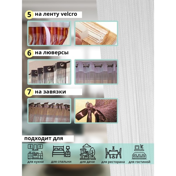 - Нитяные шторы подходят для декорирования различных помещений – гостиной, кафе, офиса, спальни и даже кухни.