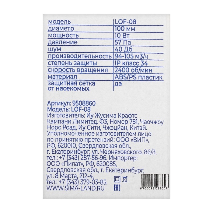 Вентилятор вытяжной ZEIN LOF-08, d=100 мм, 220 В, без выключателя