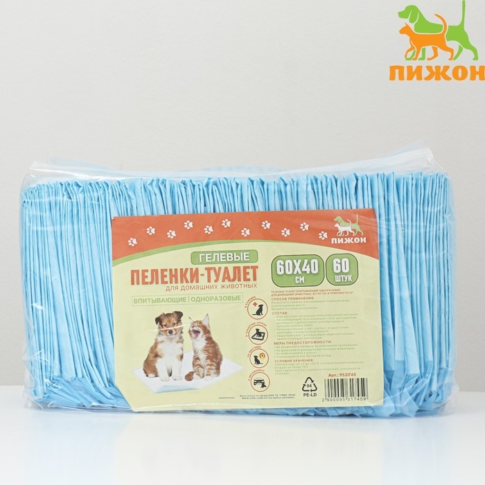 Пеленки впитывающие "ПИЖОН" для животных гелевые, 60 х 40 см, набор 60 шт