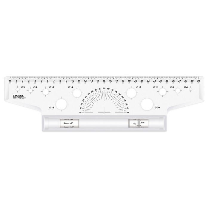 Рейсшина 30 см предназначена для выполнения чертёжных и измерительных работ. Линейка-рейсшина оборудована металлическим роликом, и идеально подходит для нанесения ровных параллельных линий. Длина шкалы – 30 см. Благодаря специальному покрытию ролика линейка не проскальзывает по бумаге. На изделии предусмотрен транспортир 180° и 10 трафаретов окружностей. Изготовлена из качественного полистирола. Рейсшина упакована в картонную коробку с европодвесом. Цвет изделия - прозрачный бесцветный.