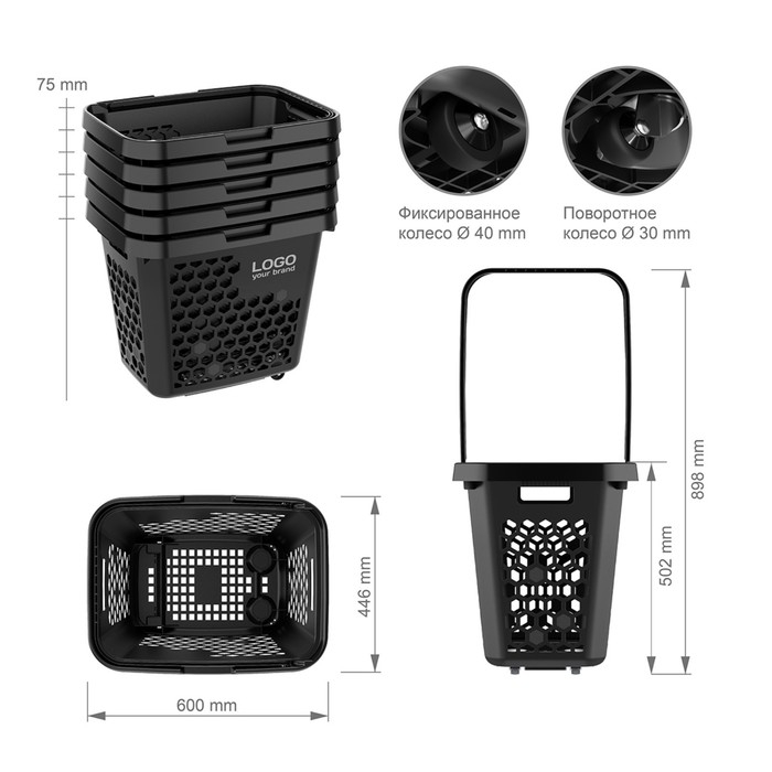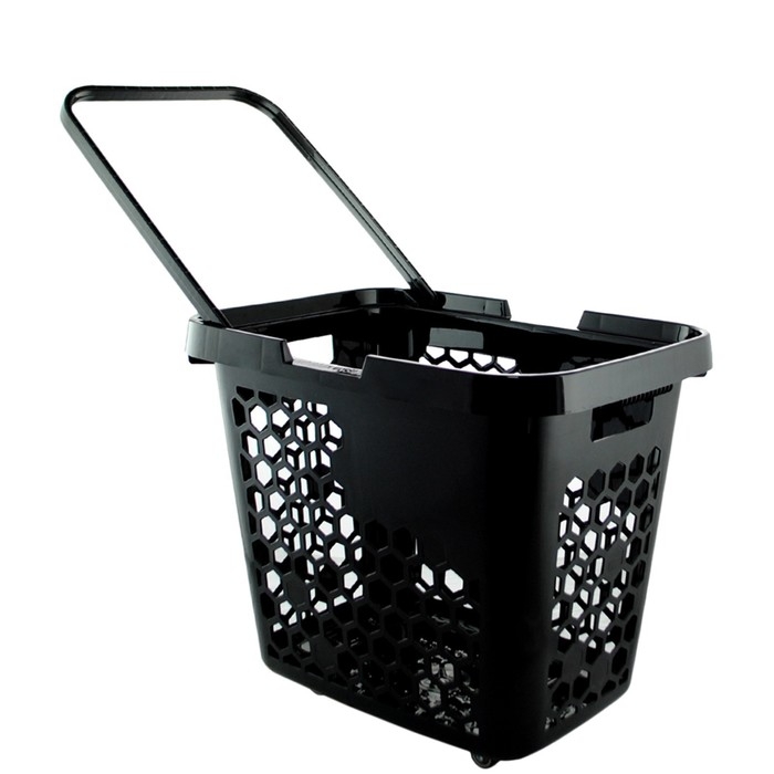Небольшая корзина-тележка на 80 литров подойдёт для маленького торгового пространства. Благодаря удлинённой ручке и колёсикам с ней легко передвигаться по залу.