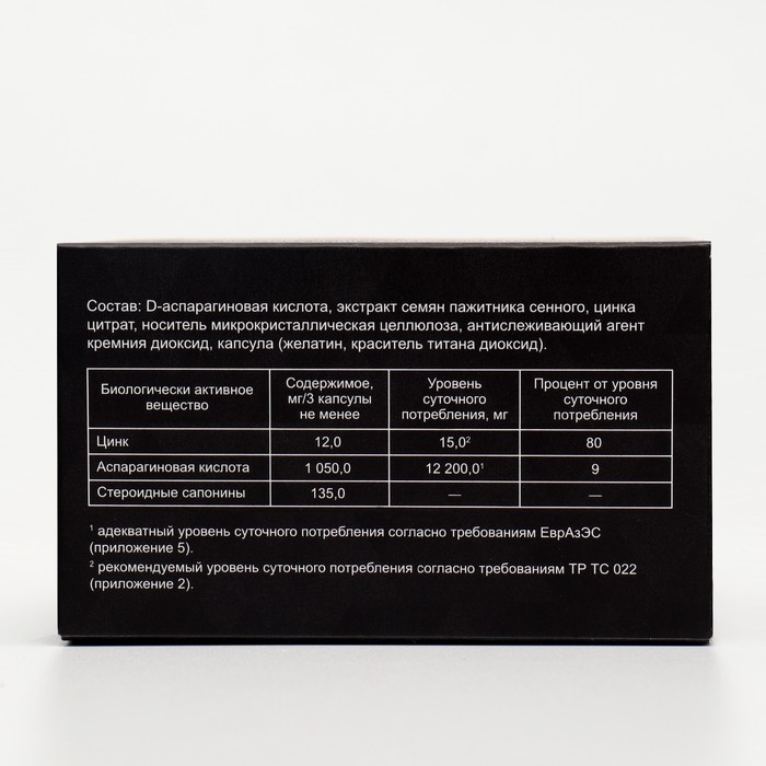 **Состав: D-аспарагиновая кислота, экстракт семян пажитника сенного, цинка цитрат, носитель микрокристаллическая целлюлоза, антислеживающий агент кремния диоксид, капсула (желатин, краситель титана диоксид).