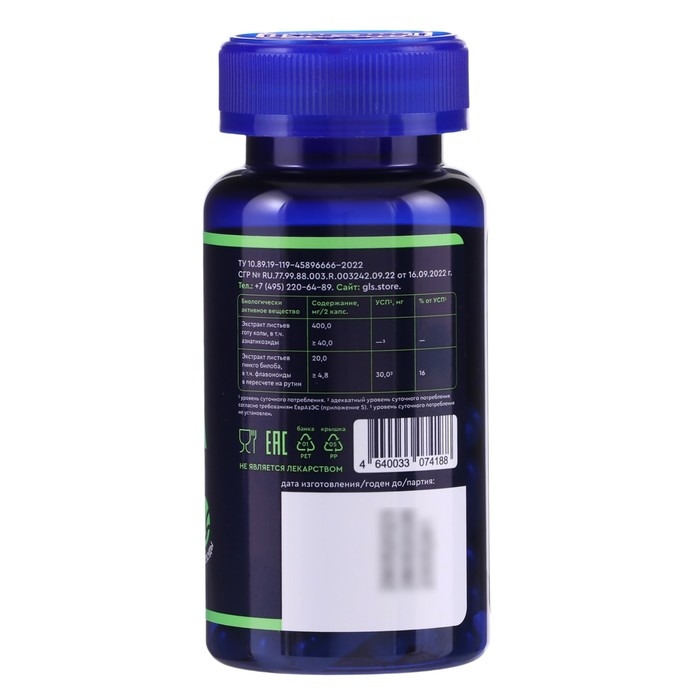 Гинкго Билоба + Готу Кола GLS для мозга, памяти и концентрации, 60 капсул по 380 мг