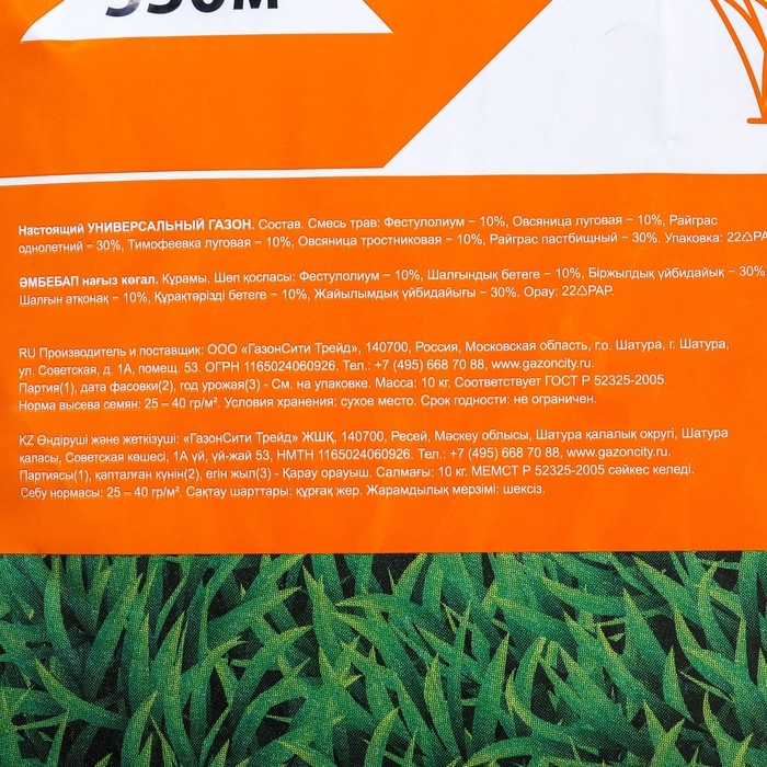 Семена газонной травы Универсальная упакованы в удобный мешок весом 10 кг. Этого достаточно для посева на площадь до 500 квадратных метров. Семена имеют высокую всхожесть, что позволяет получить равномерный и красивый газон.
