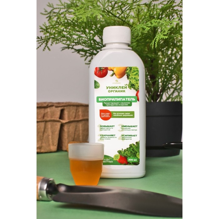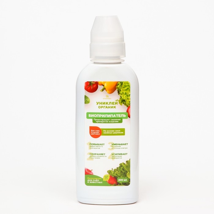 Биоприлипатель «Униклей Органик» (биоклей) - используется для повышения эффективности обработок защитными и питательными препаратами на овощных и плодово-ягодных культурах, декоративных растениях, для лучшего прилипания средств защиты растений, сохранения влаги, уменьшения испарения, способствует сохранению урожая.