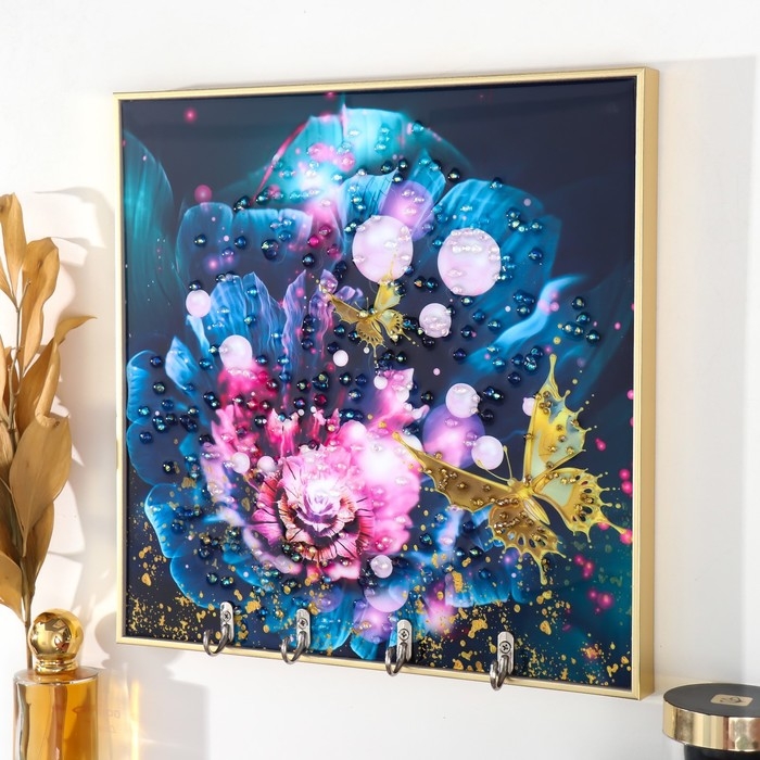 Ключница пластик, МДФ 4 крючка "Бабочки на цветке" стразы, золото 29х1,8х29 см