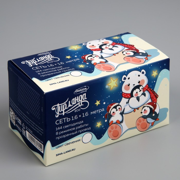Гирлянда «Сеть» 1.6 × 1.6 м, IP20, прозрачная нить, 144 LED, свечение белое, 8 режимов, 220 В