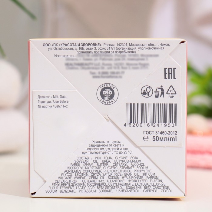 Состав: Aqua, Glycine Soja (Soybean) Oil, Urea, Butyrospermum Parkii (Shea) Butter, Cetearyl Alcohol, Isopropyl Myristate, Glyceryl Stearate, Sodium Acrylates Copolymer, Phenoxyethanol, Propylene glycol, Lecithin, Oryza Sativa (Rice) Bran Oil, Triticum Vulgare (Wheat) Germ Oil, Sodium Hyaluronate, Parfum, Ceteareth-20, Ceteareth-12, Allantoine, Hydrolyzed Elastin, Ethylhehylglycerin, Tocopherol, Cetyl Palmitate, Lactobacillus/Rye Flour Ferment, Lactic Acid, Beta-Sitosterol, Squalene, Beta Carotene, Sodium benzoate, Potassium sorbate, 1,2-Hexanediol, Caprylyl Glycol.